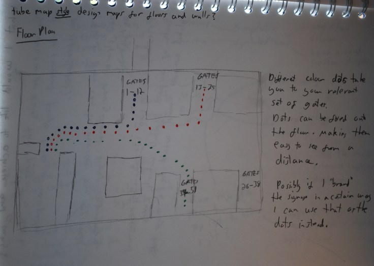 In-between most of my sketch pad pages I have already begun thinking of different design concepts that could be integrated into an airport to make life easier and less stressful for those travelling. This particular sketch (see below) shows the concept of; each set of gates have their own colour code, this colour gets translated to the floor, maybe in little circles, potentially arrows. These are to be followed thus making it easier to find your gate.