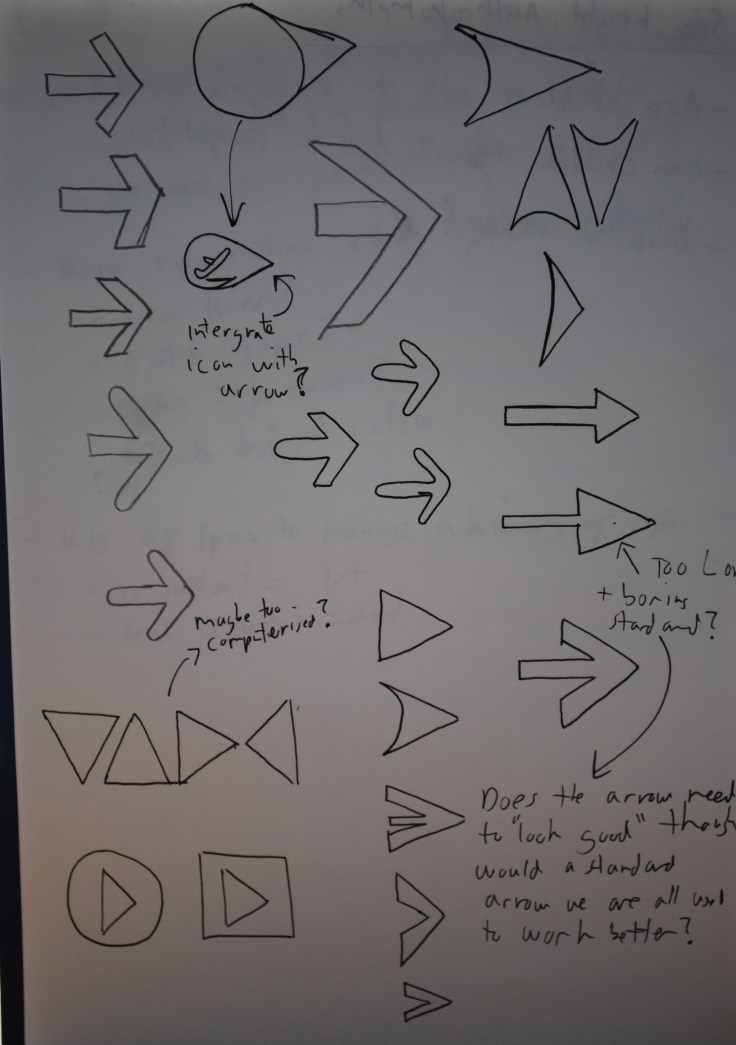We can all see that these are arrows, but which one clicks first? I personally think the left arrow is the least clear, the middle is easier to establish and also looks quite aesthetic. But the right arrow is what we know from a very young age as being an arrow, we can associate that shape as a direction instantly without a seconds hesitation. So in this sense why should it not be used? Also, maybe I should design a full set of icons in this project which is based plainly and simply around what we automatically know, and less about what looks good. Below is my page of arrows, take note of the small arrow with an aeroplane, this was a concept of including the symbol inside the arrow: