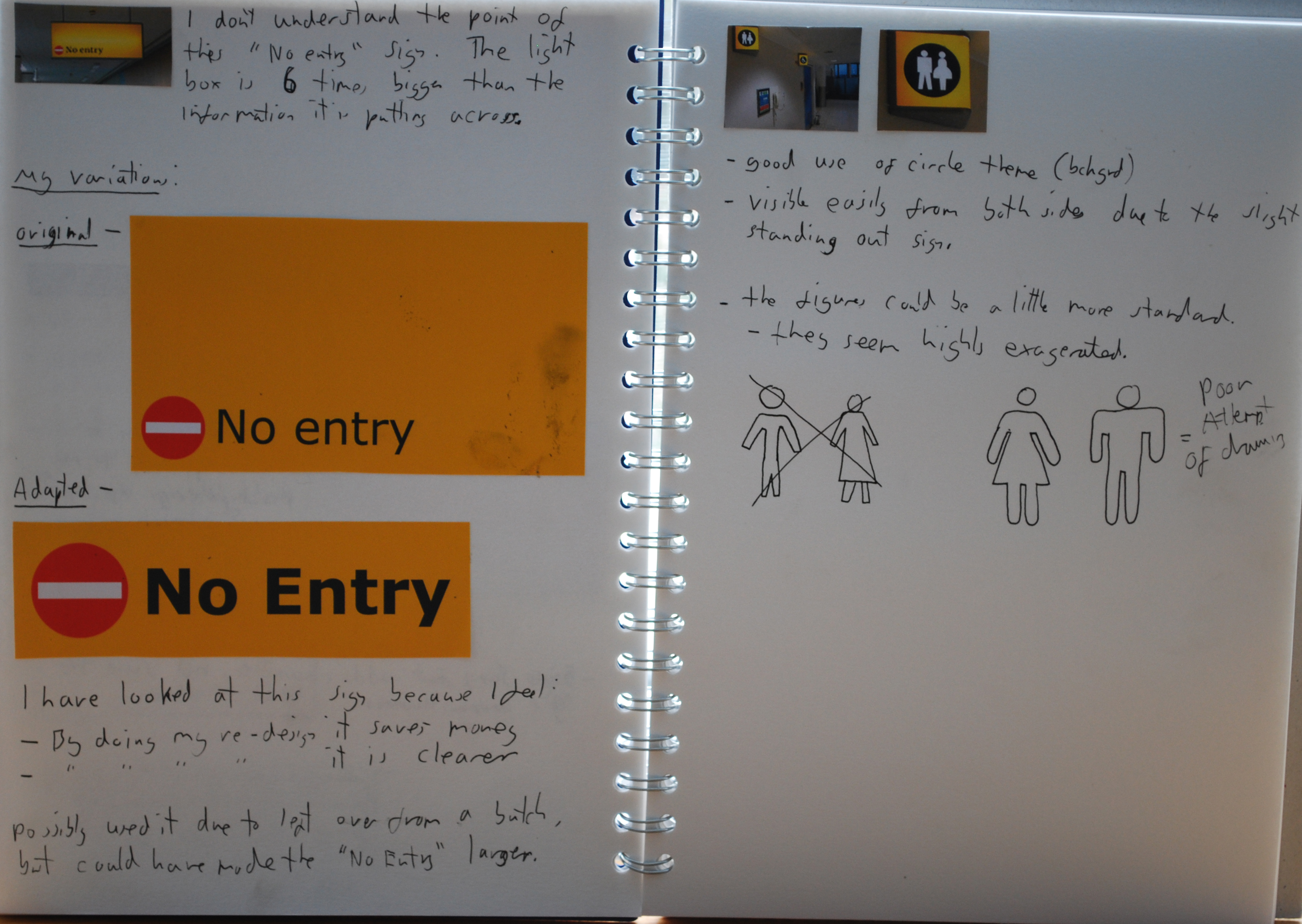 Next up are just a few pages where i have discussed current signage, drawn out a few of my own concepts and also a couple of computer ones: