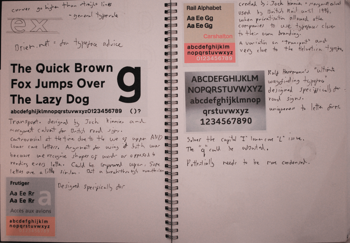 First up, one of my research pages, looking into current wayfinding typefaces and how they are formed.