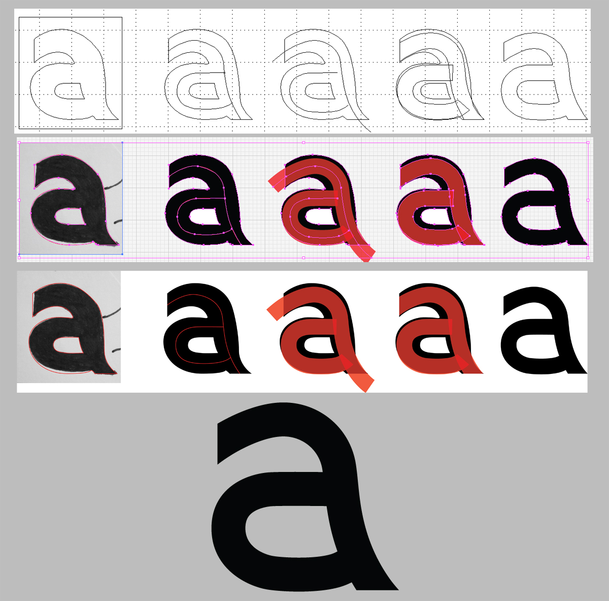 The next series of images are just the stages I used whilst on the computer to develop my letter form. You can also see how my latest design for an “a” holds up against my initial design. I think the old version is possibly better for wayfinding due to it’s condensed nature. I feel that the second “a” has a little more charm to it. It still needs a little work on it to sort out some of the edges which are perhaps a little too straight, but it is coming along. The hardest thing I have found is matching up smaller letters with the larger ones such as “d” and “b”.