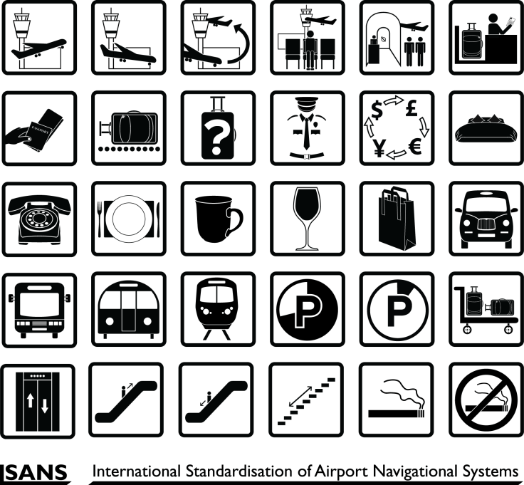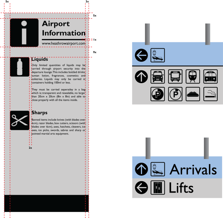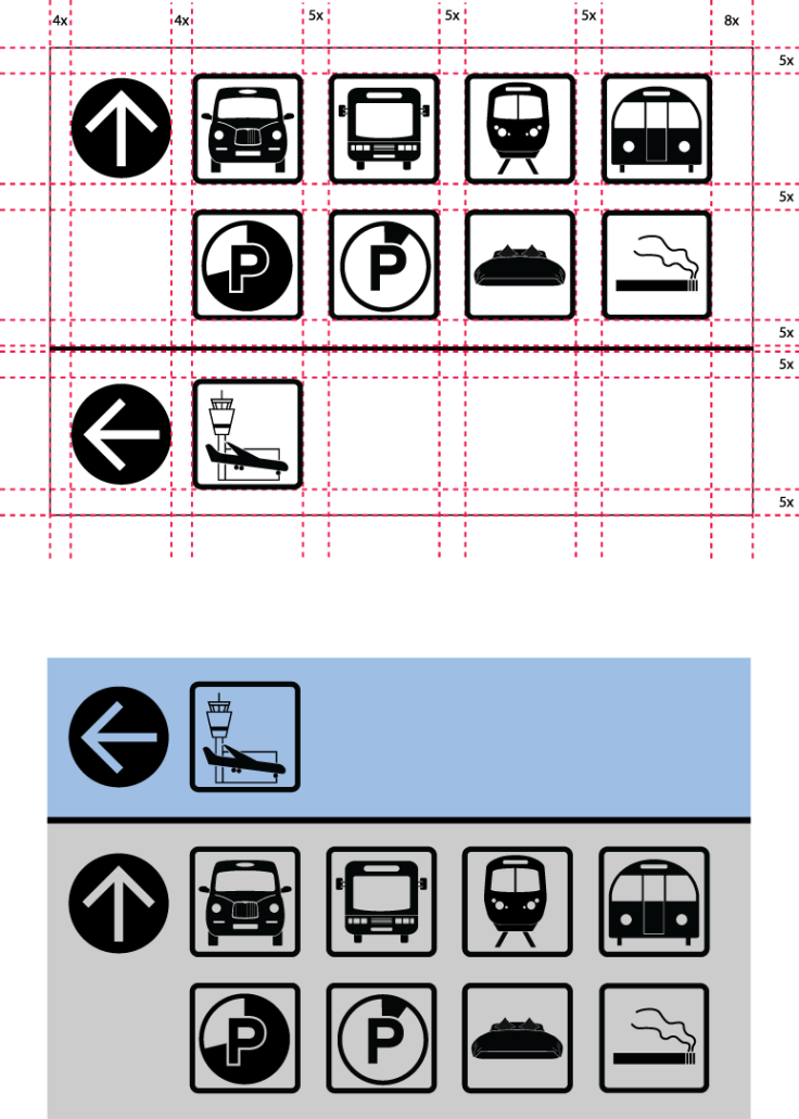 Also, some specs of how the icons can be used with Gill Sans to provide a sign system. The icons can also be used on their own to provide a wordless system:
