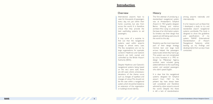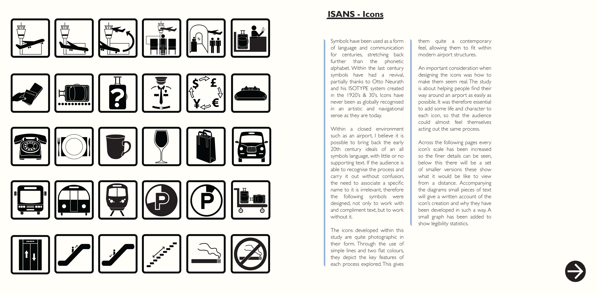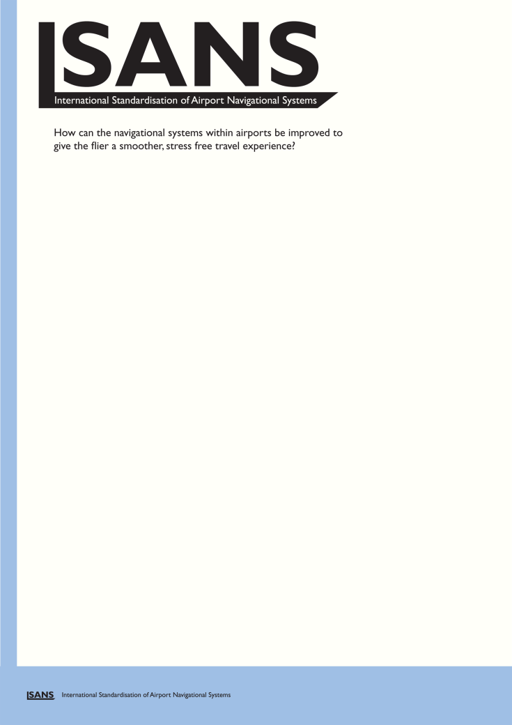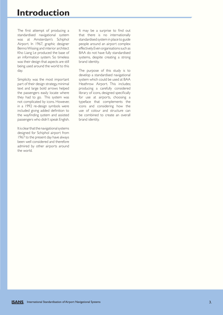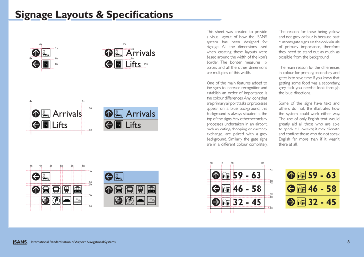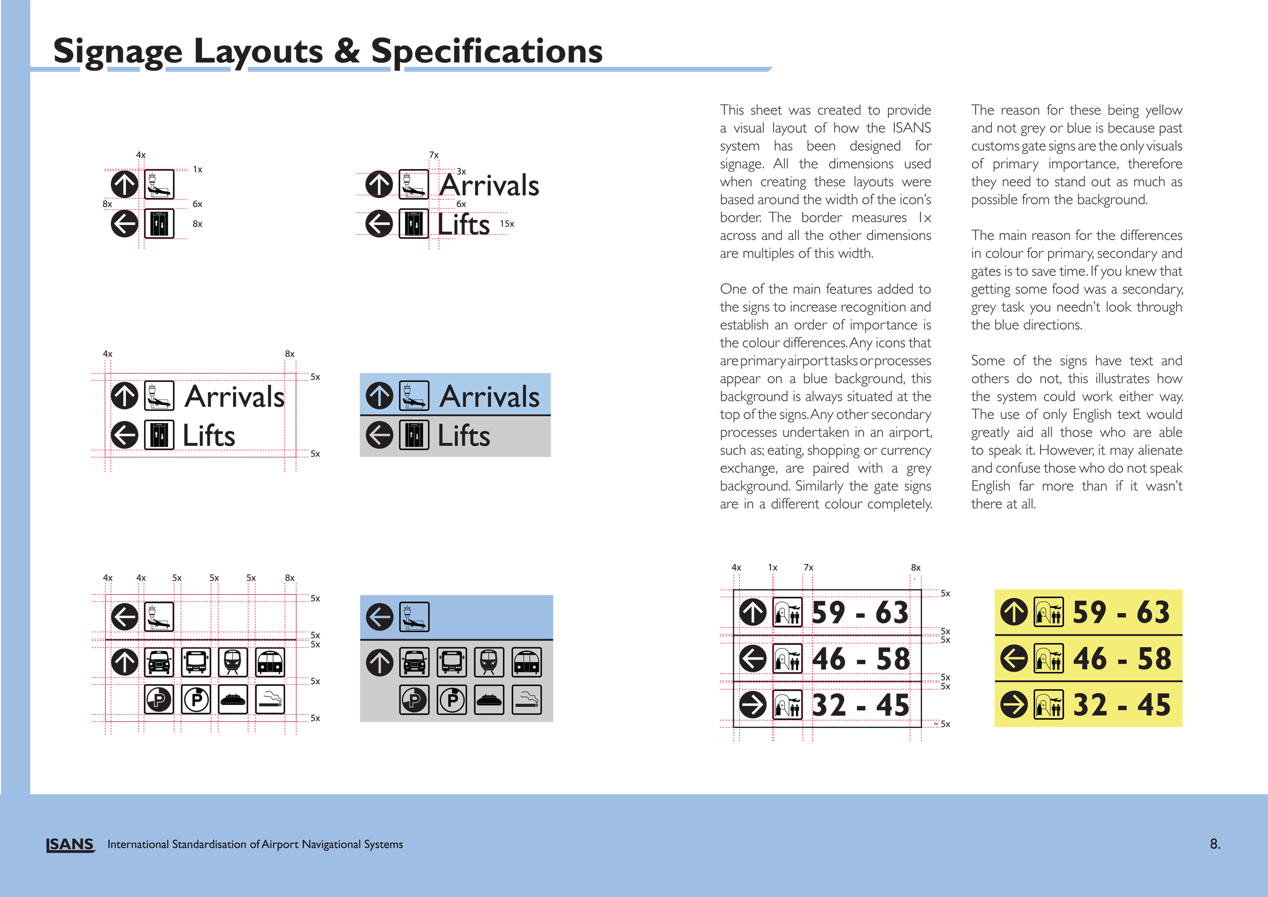 The purpose of this study is to consider airport signage and develop a navigational system, which could be used at BAA Heathrow with a view to form the basis of an international standard. This includes creating a carefully considered library of icons designed specifically for use at airports, choosing a typeface that compliments the icons and considering how the use of colour and structure can be combined to create an overall brand identity.