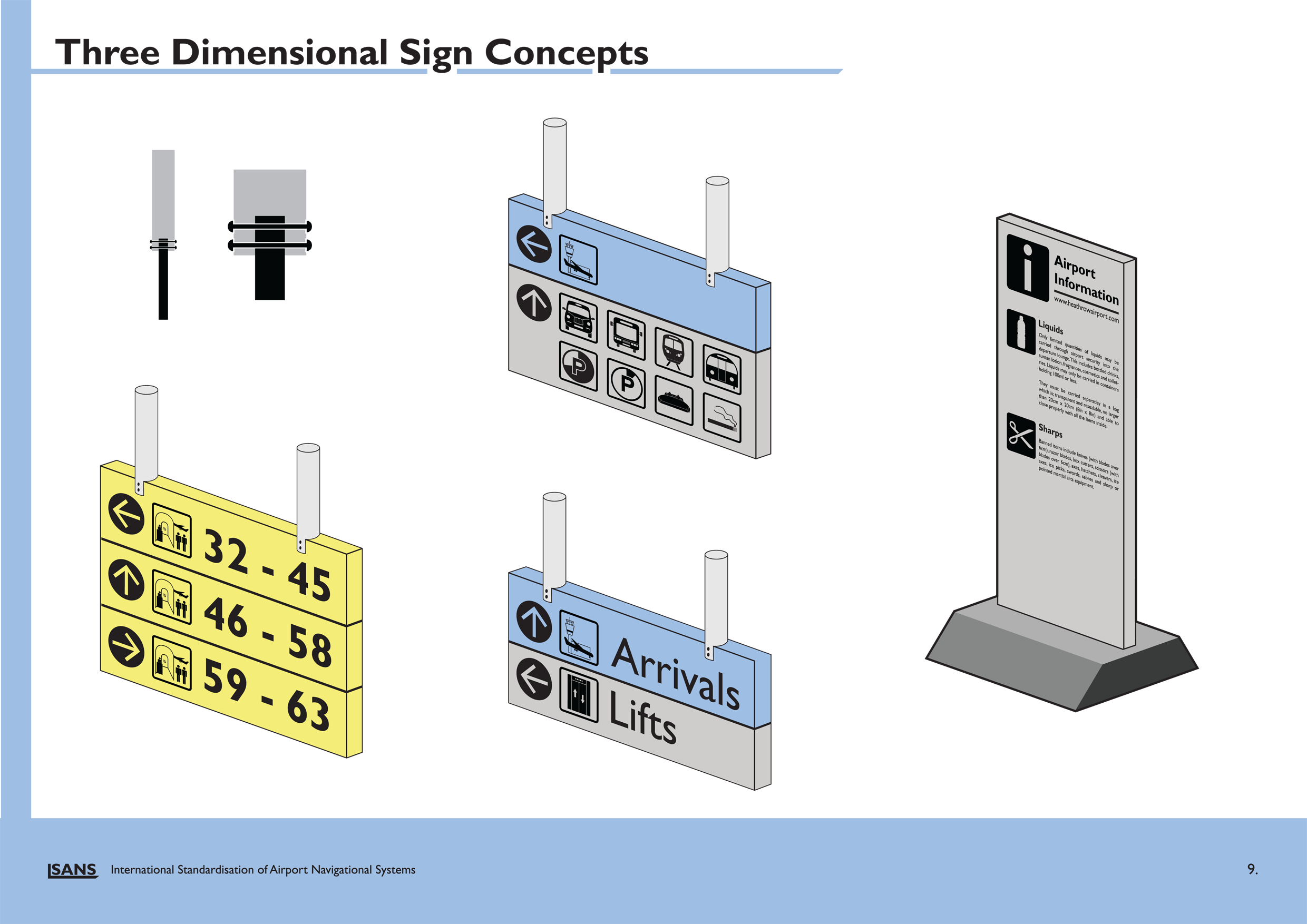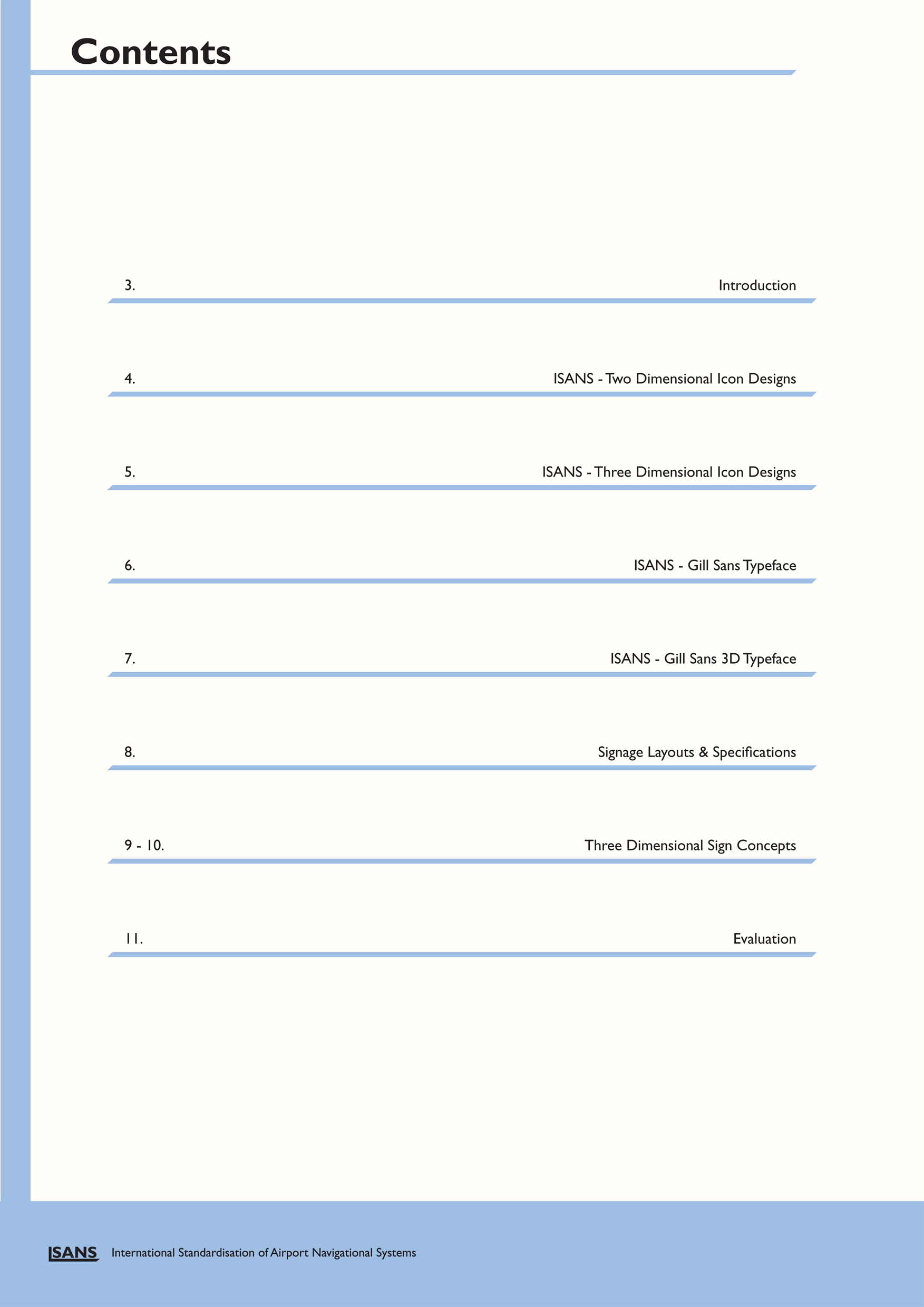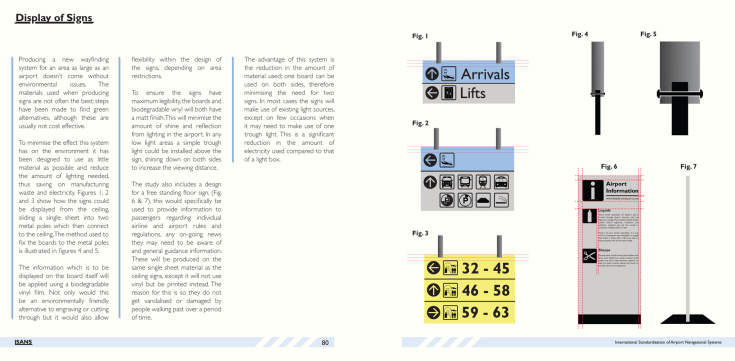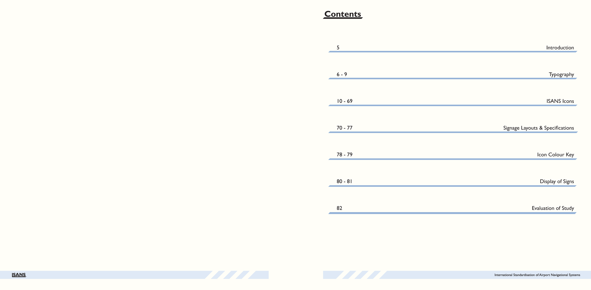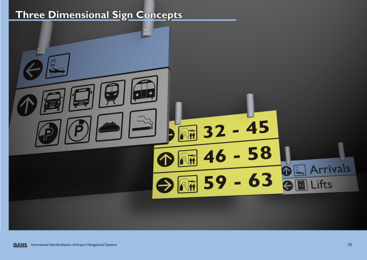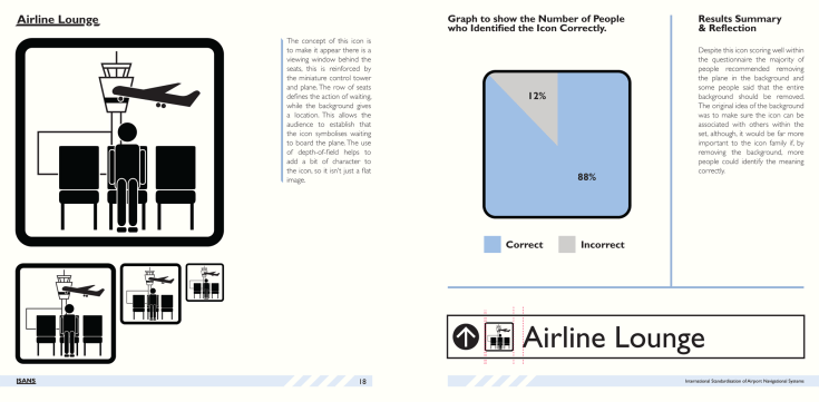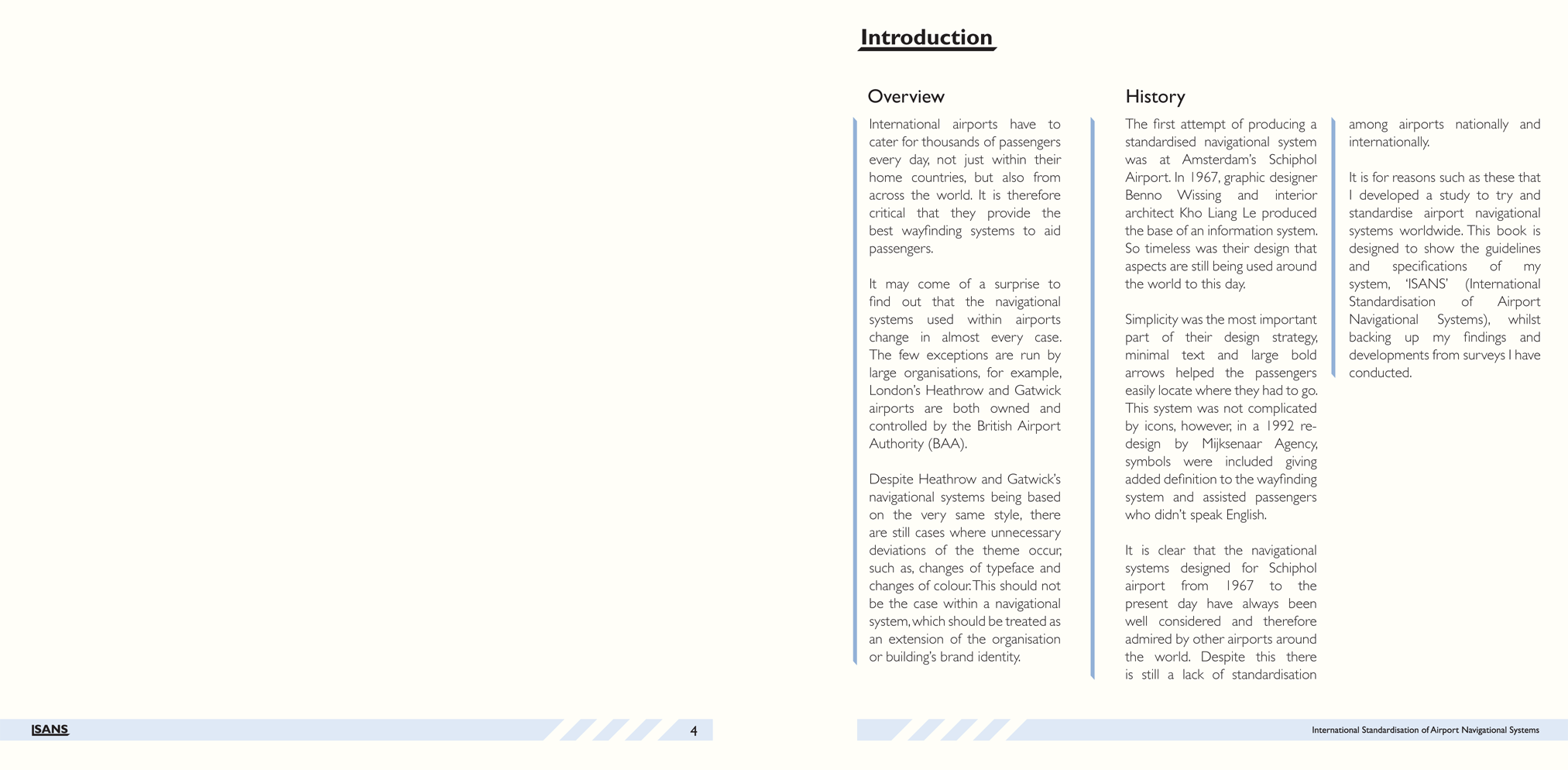 The purpose of this study is to consider airport signage and develop a navigational system, which could be used at BAA Heathrow with a view to form the basis of an international standard. This includes creating a carefully considered library of icons designed specifically for use at airports, choosing a typeface that compliments the icons and considering how the use of colour and structure can be combined to create an overall brand identity.