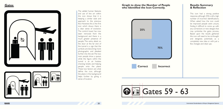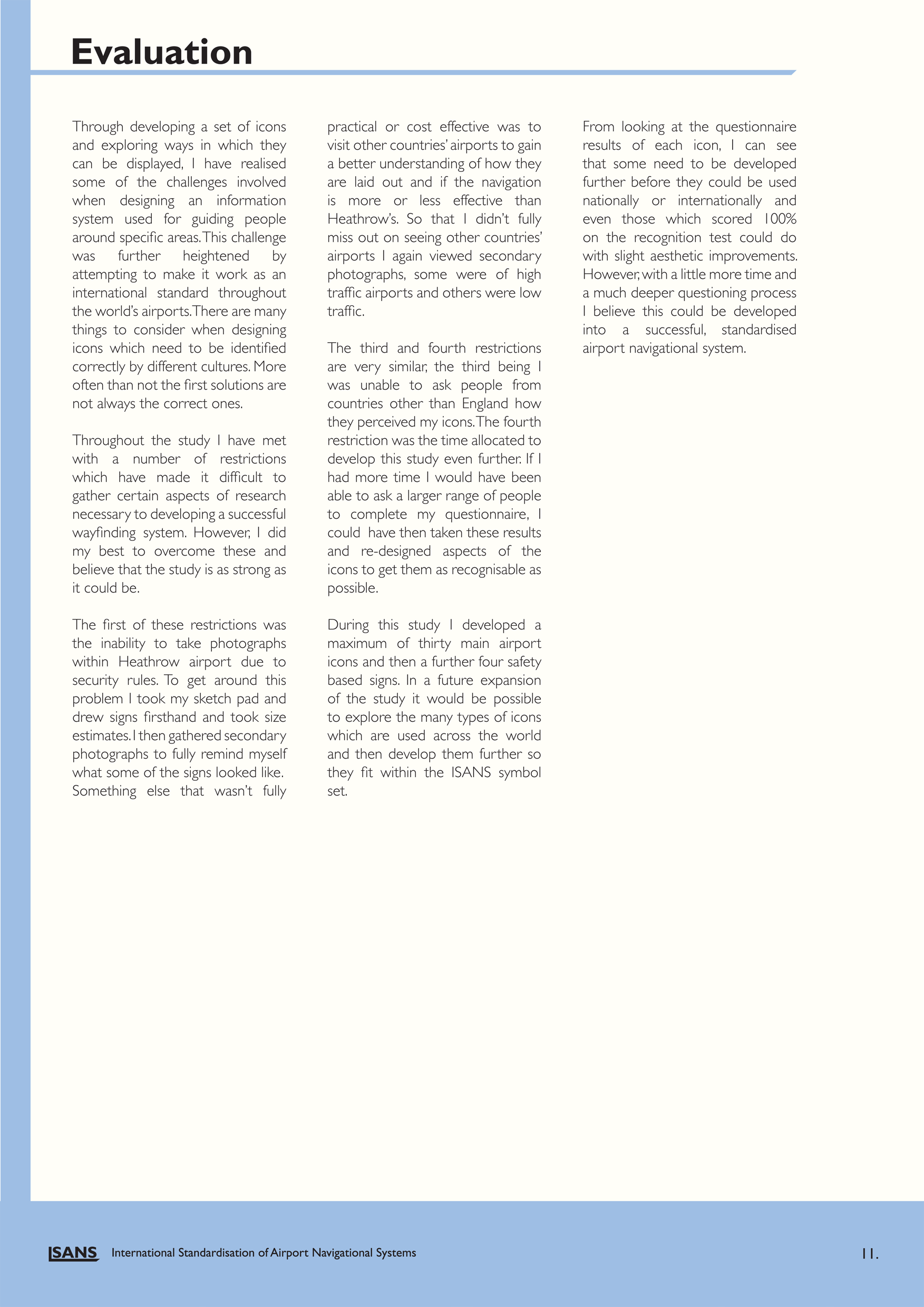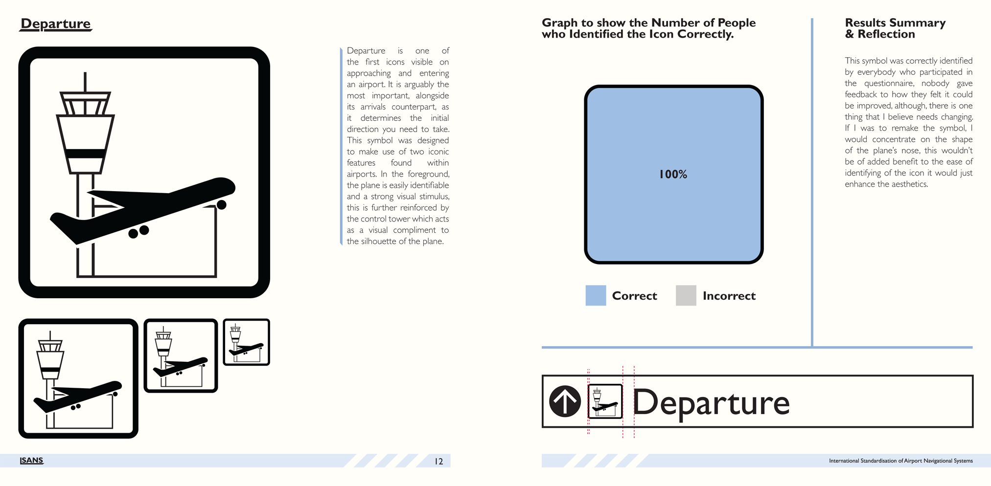 From looking at the questionnaire results of each icon, I can see that some need to be developed further before they could be used nationally or internationally and even those which scored 100% on the recognition test could do with slight aesthetic improvements. However, with a little more time and a much deeper questioning process I believe this could be developed into a successful, standardised airport navigational system.