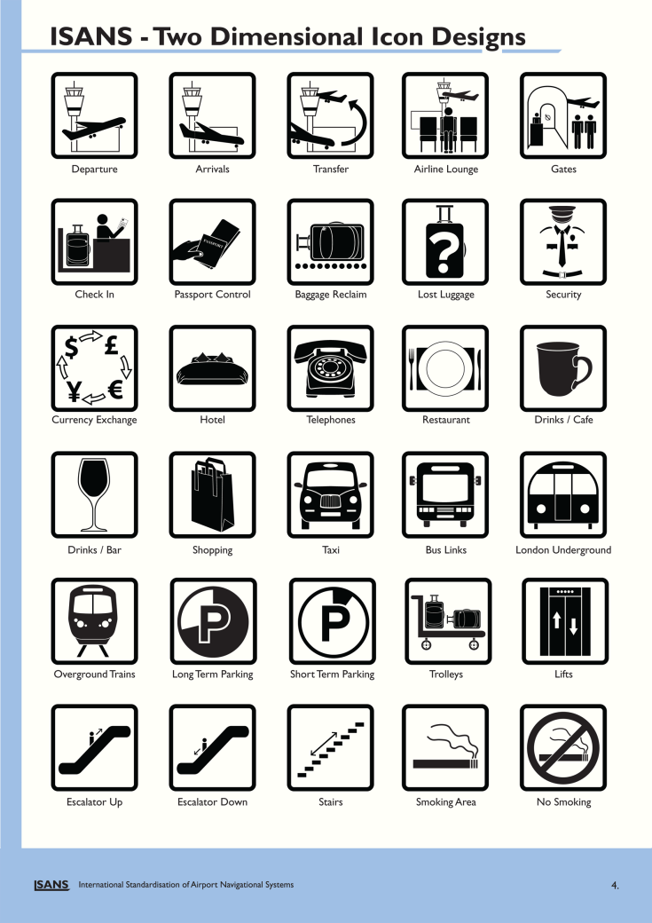 During this study I developed a maximum of thirty main airport icons and then a further four safety based signs. In a future expansion of the study it would be possible to explore the many types of icons which are used across the world and then develop them further so they fit within the ISANS symbol set.