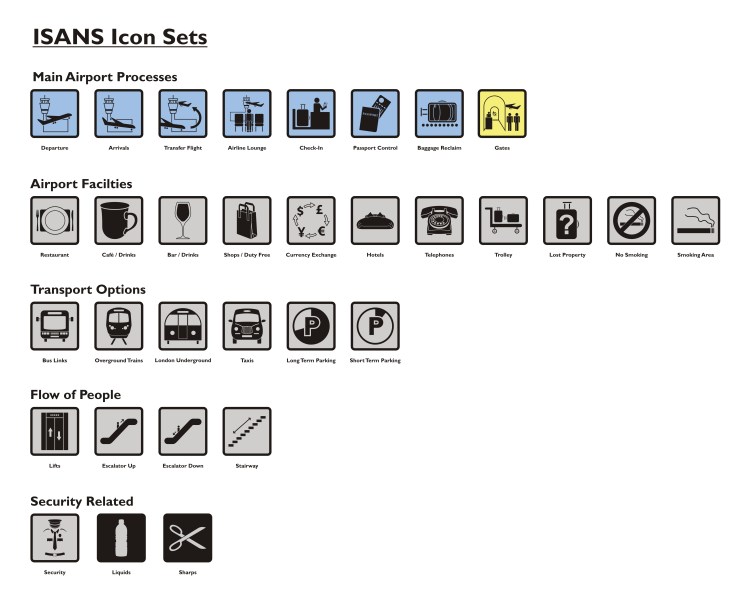 The image below (click to view much larger) shows all the currently updated icons, I have been working on these over the past week on and off and can now say I’m very pleased with how they have turned out. Each has been carefully vectorised and smoothed out so there shouldn’t be any nasty bumps. The colours refer to the background colour they would go against on the signs themselves. Blue is for any main processes undertaken at an airport, grey is used for any secondary processes and the yellow is for gate numbers.