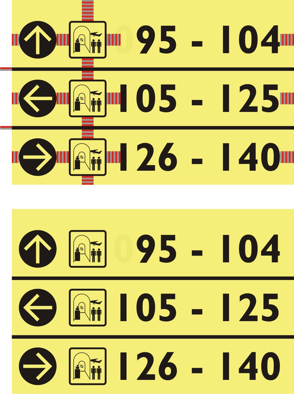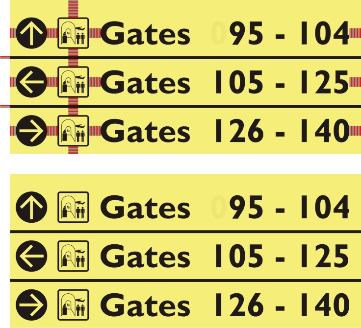 This example of the gate signs i think works a lot better without the type than with. There is no need to have “Gates” repeated down the sign.