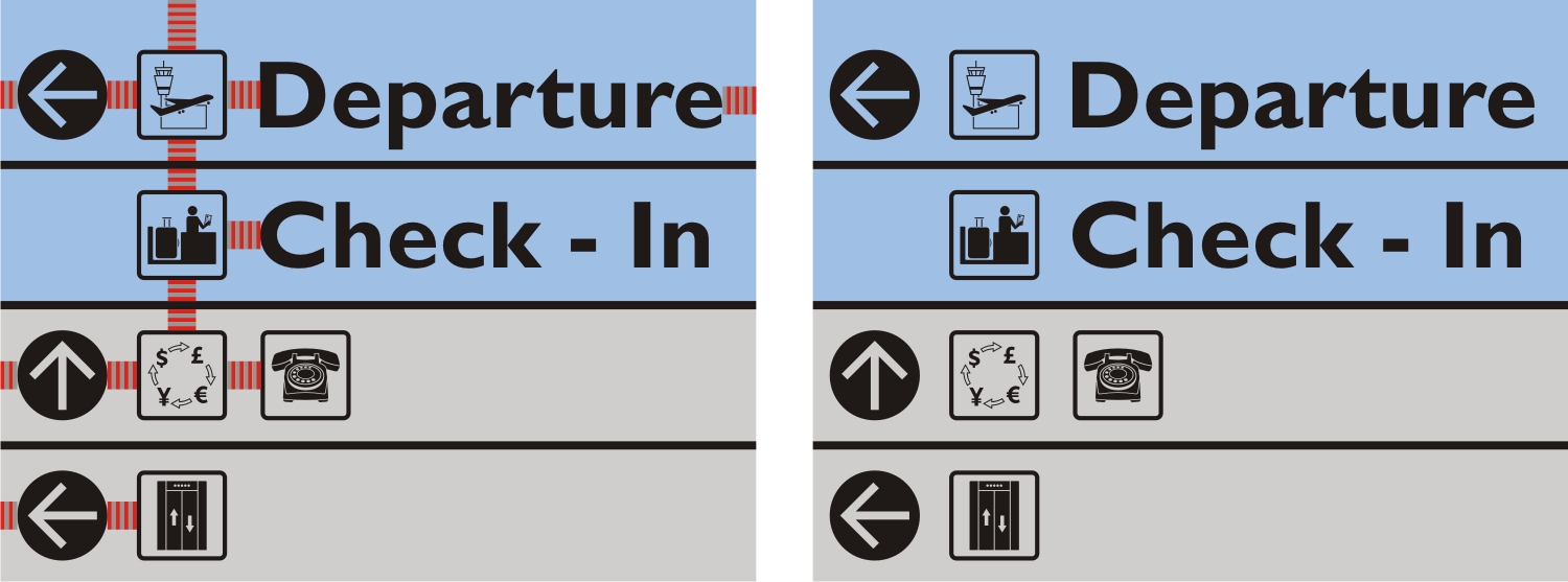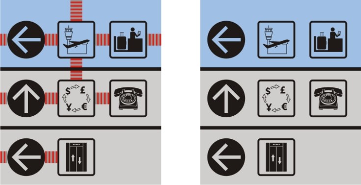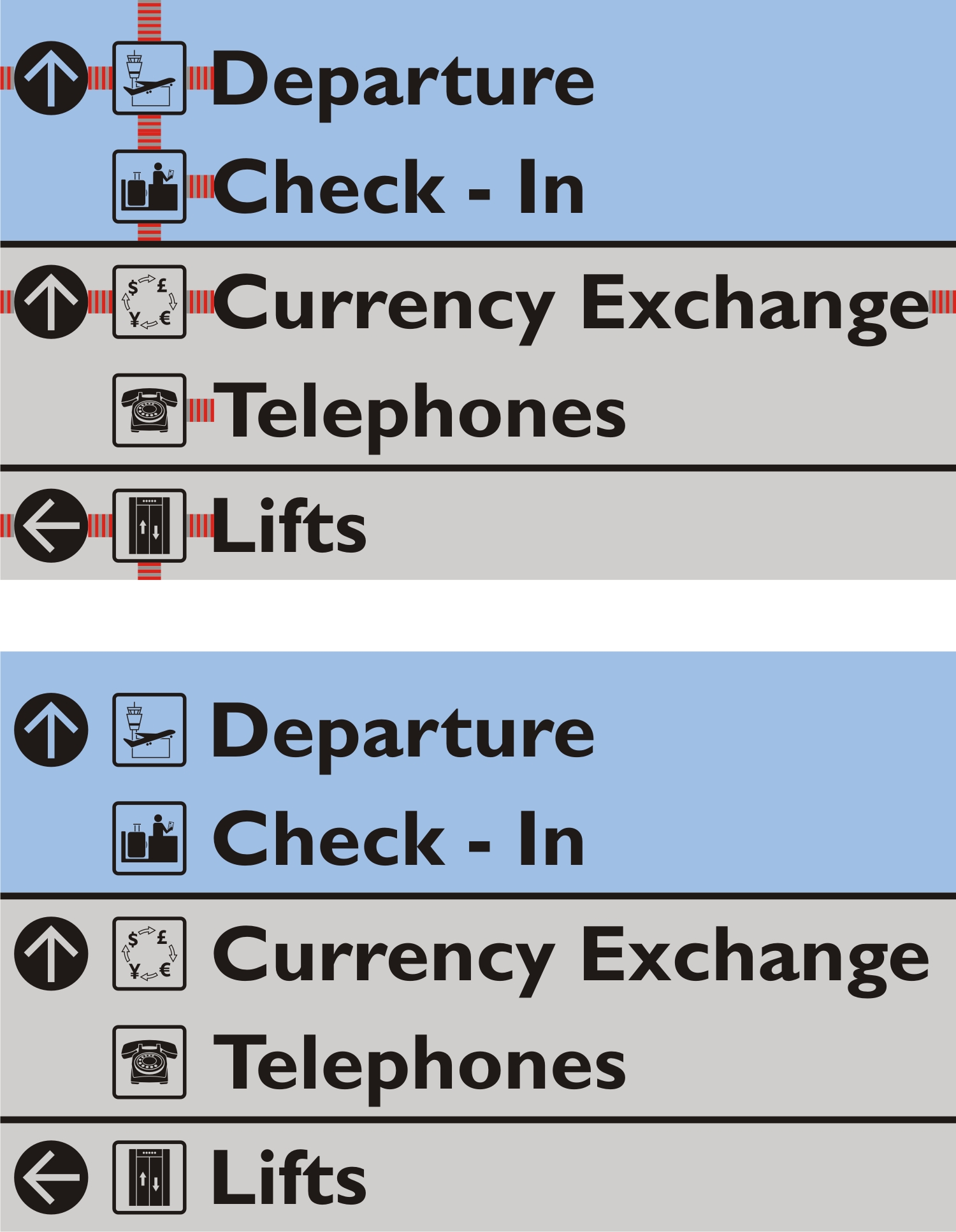 The first images show possible ways of laying out the signs for gate numbers. These have been purpoesely coloured yellow to stand out from the rest of the signs within the airport environment. The red and grey bars show the spacing between each element of the sign. Each bar is an icons border width apart, this allows for proportionate measurements when scaling, instead of finding a formula if using a mm scale.