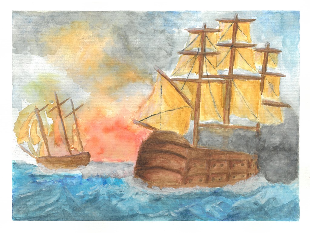 The below painting, “Ships at Battle”, was based on the 1939 painting, ‘Men o’ War passing on the open sea’ by artist, Michael Zeno Diemer. I was inspired by my first attempt a few years back to create an atmospheric naval combat scene but, this time, I used an image reference to help define the ship shapes.